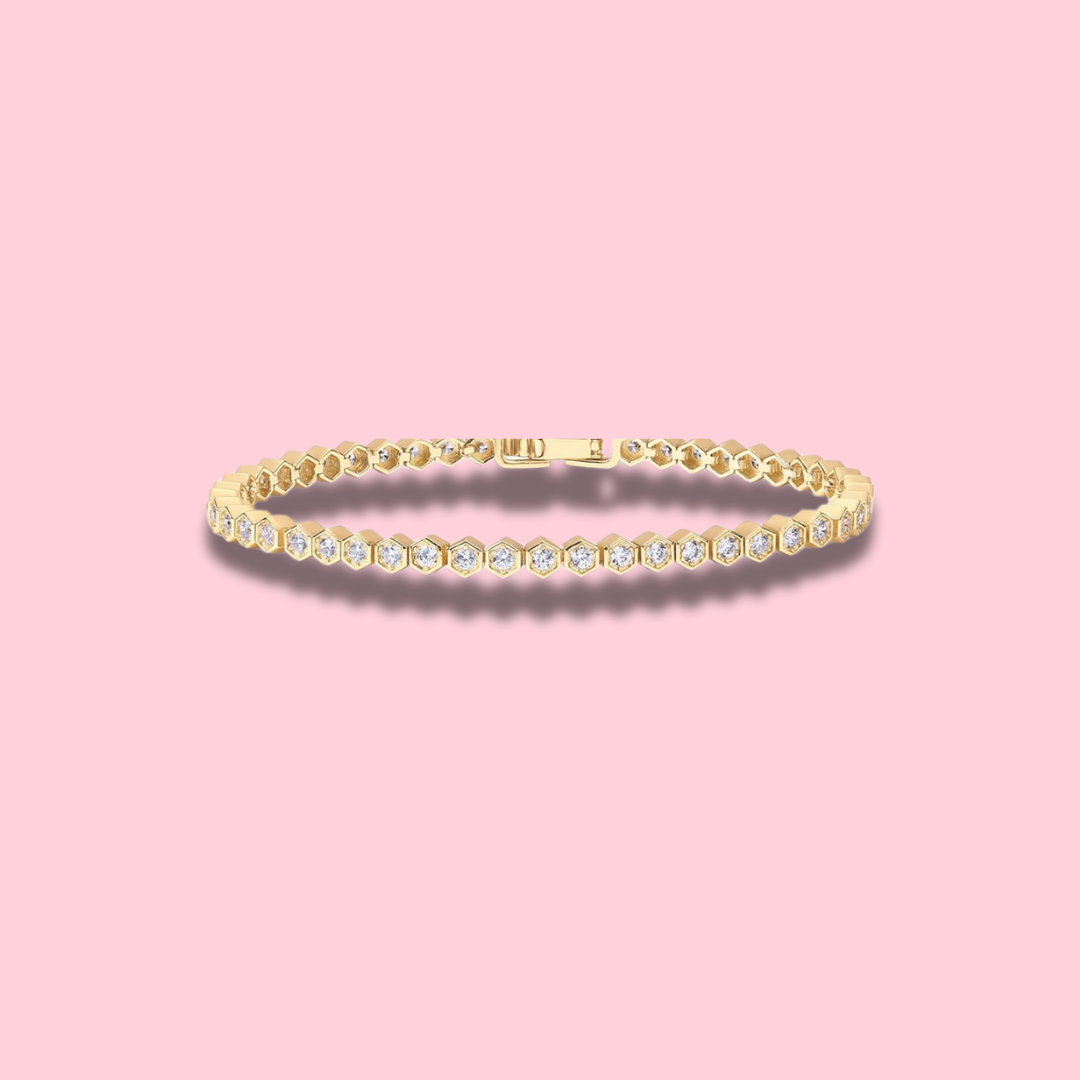 14K Gold Plated 2mm Cubic Zirconia Honeycomb Tennis Bracelet - Honeycomb tennis bracelet featuring round 2mm cubic zirconia stones in six-prong basket settings. Measures 7.0 inches in length. Cubic Zirconia set in Lead-free, Eco-friendly and hypoallergenic setting. This stunning bracelet is then 14K Gold Plated to ensure a long-lasting and brilliant finish.