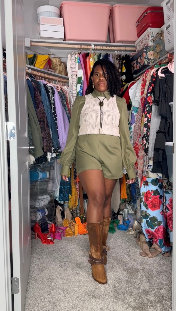 The vest adds dimension and coziness to the jumpsuit, while the bolo tie and cowboy boots give it a Western-inspired twist.