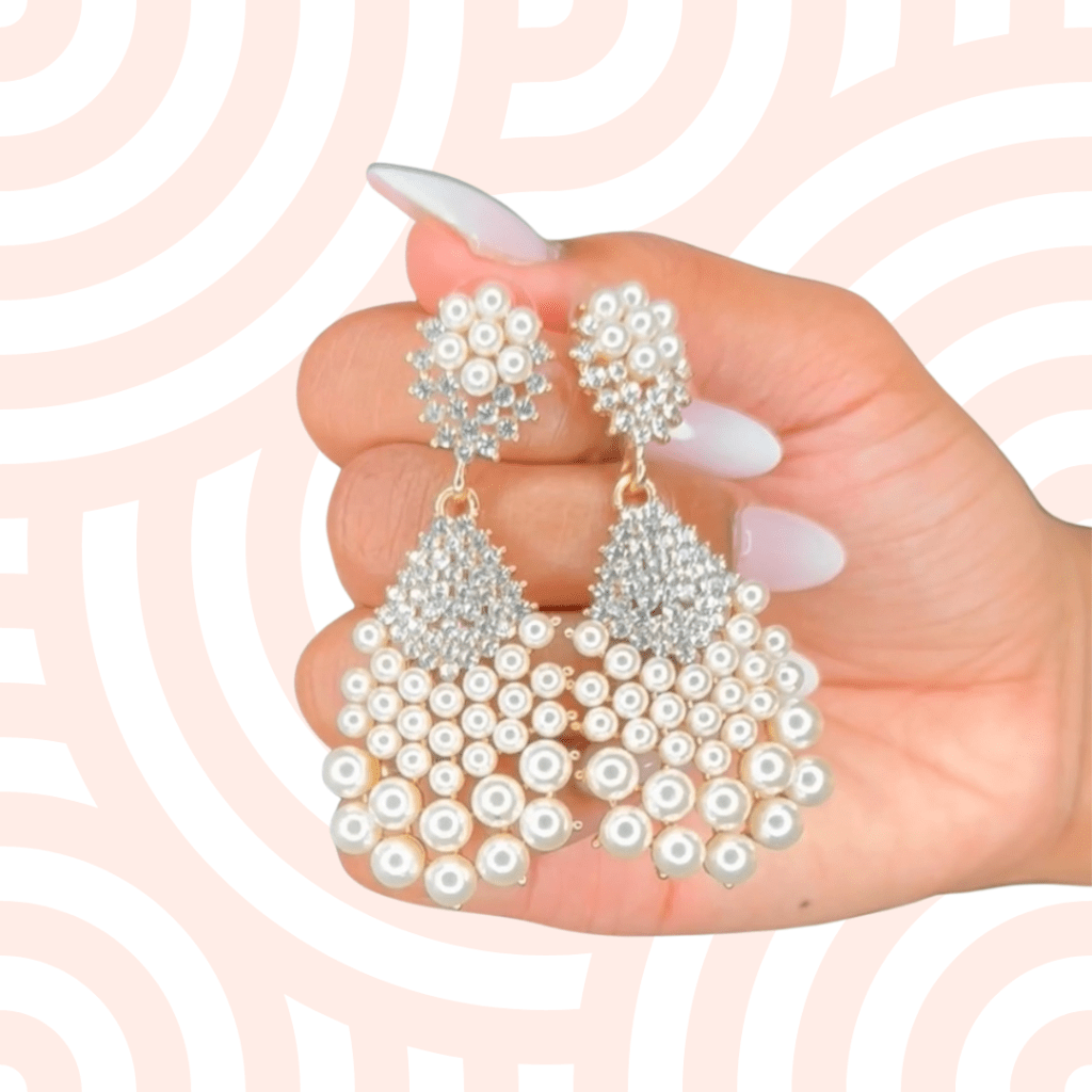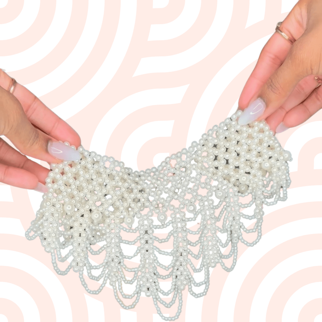 The mesh skirt overlay adds unexpected texture to the dress, while the pearl accessories bring elegance and cohesion.