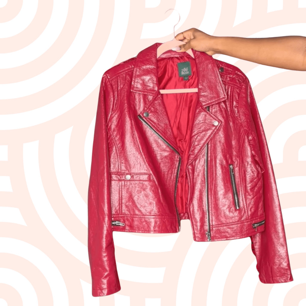 The cheetah print is the star, while the black bodysuit and sleek belt keep it grounded. The red jacket and cherry earrings tie it all together with playful pops of color.