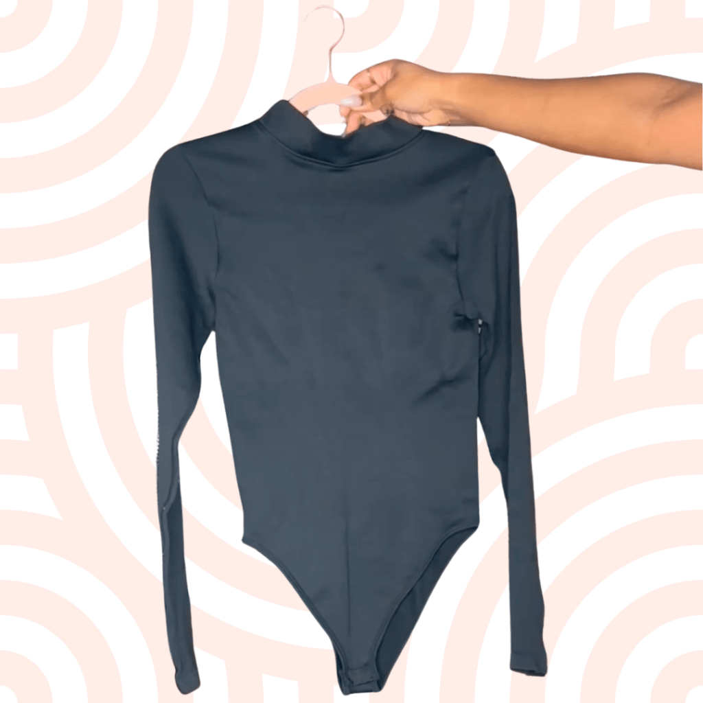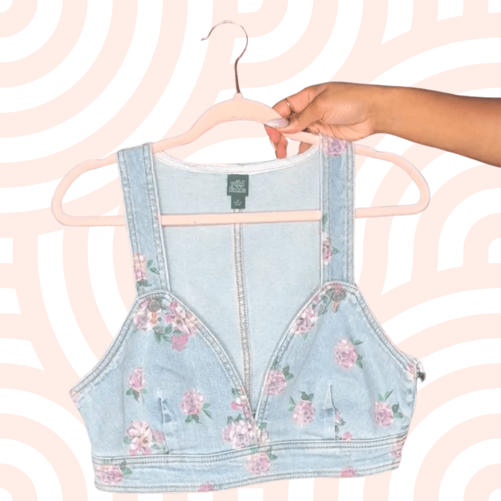 The fitted bodysuit contrasts with the textured mini skirt, while the floral vest adds an unexpected layer of interest. Sneakers keep it casual but stylish.