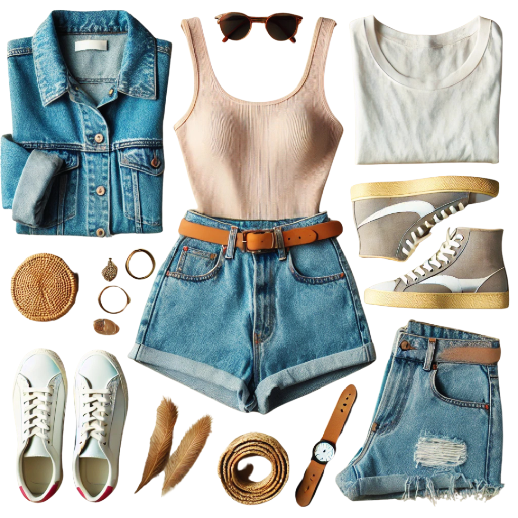 • Combine a fitted tank top with high-waisted denim shorts.