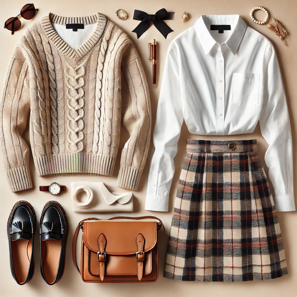 • Outfit Idea: Go for a layered look with a crisp white button-down shirt under a knit sweater or cardigan in fall colors. Pair it with a plaid skirt or tailored chinos and finish with loafers or riding boots. Add a structured tote and a watch for a classic finish.