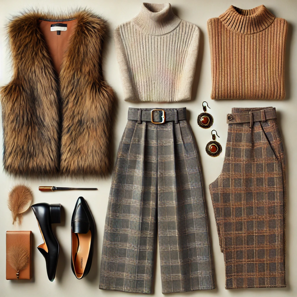 • Outfit Idea: Go for a 1970s-inspired outfit with high-waisted plaid trousers, a fitted turtleneck, and a cozy faux-fur vest. Finish the look with classic loafers or ankle boots and oversized retro earrings for that old-school glamour.