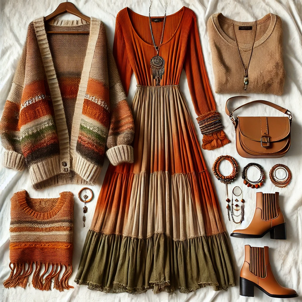 • Outfit Idea: Try a long, flowy maxi dress in warm, autumnal colors like burnt orange, olive green, or rust. Layer with a chunky knit cardigan or a fringed shawl for warmth. Add ankle boots and stack on beaded bracelets or layered necklaces for that true boho look.