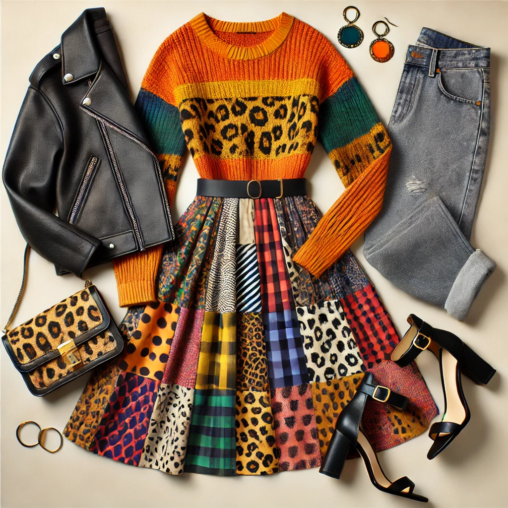• Outfit Idea: Start with a patterned midi skirt in a fun print, like leopard or plaid, and layer it with a bold-colored sweater. Add a denim or leather jacket for contrast, and finish with combat boots or chunky heels. Go wild with accessories—layered necklaces, funky earrings, or a statement scarf.