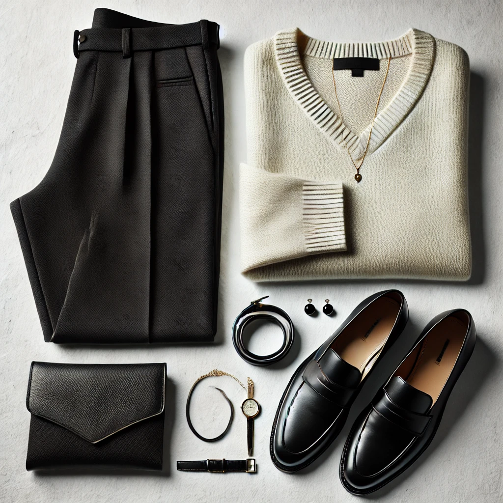 • Outfit Idea: Try a monochrome look with tailored black pants and a soft, cream cashmere sweater. Add sleek leather loafers or ankle boots, and finish with delicate gold jewelry for a subtle touch.
