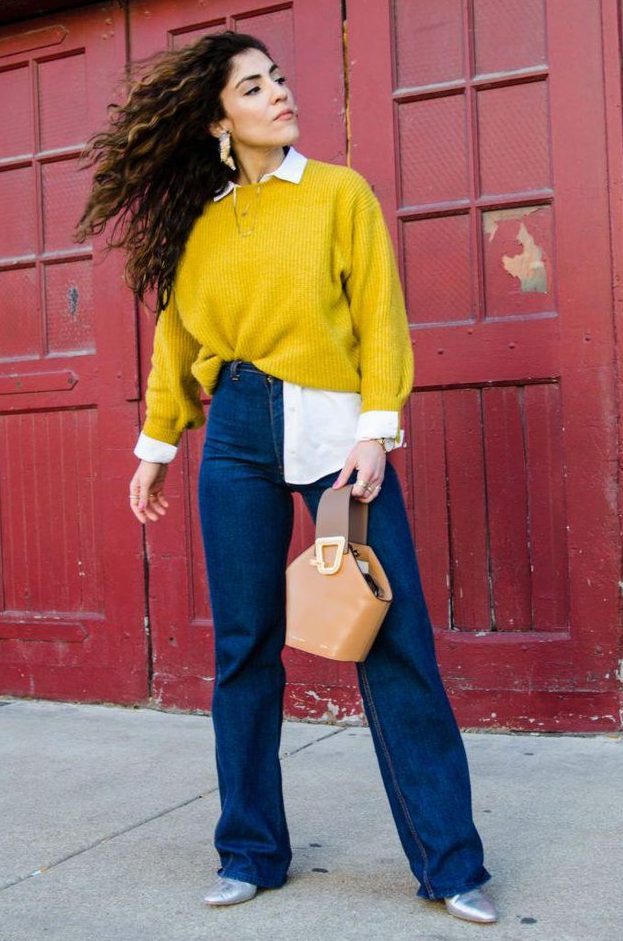 💛 Bright & Cheerful = Yellow blouse + white wide-leg jeans + statement earrings + nude heels or sneakers
