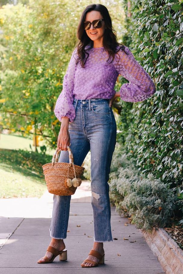 💜 Creative & Bold = Plum sweater + checkered trousers + purple loafers + silver hoops